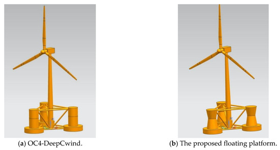 The proposed floating platform features a distinctive inward concave design at the waterline of its three external columns, setting it apart from the conventional OC4-DeepCwind platform. This unique design leads to a noteworthy reduction in the waterplane area of the proposed floating platform. Consequently, the platform, in theory, would be subjected to decreased wave loads. For this reason, the proposed design would significantly benefit the motion stability of the OFWTs in their practical application. For ease of understanding, the conceptual design of the proposed floating platform and the OC4-DeepCwind platform are shown in Figure 2.