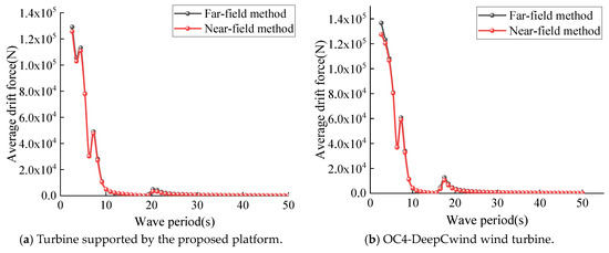 In this study, both the near-field and far-field methods described in [20,21,22] were applied to calculate the second-order wave forces for validating the effectiveness of the meshing results and the reliability of the hydrodynamic model. The second-order mean drift forces in the surge direction obtained for the OFWTs supported by the two types of floating platforms are shown in Figure 6.