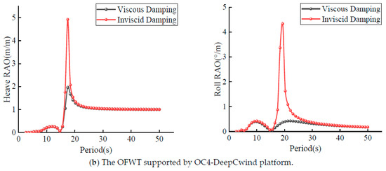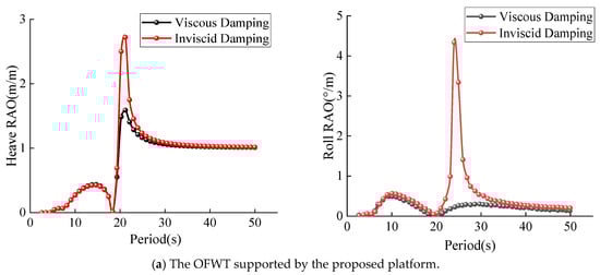 To verify the effect of the additional viscous damping on motion stability, the RAOs of the OFWT in the heave and roll directions were calculated before and after considering additional viscous damping, respectively. The results obtained when the wave incident angle is 0° are shown in Figure 7. Figure 7a depicts the calculated RAOs of the OFWT when it is supported by the proposed floating platform, while Figure 7b shows the RAOs of the OFWT when it is supported by the OC4-DeepCwind platform.