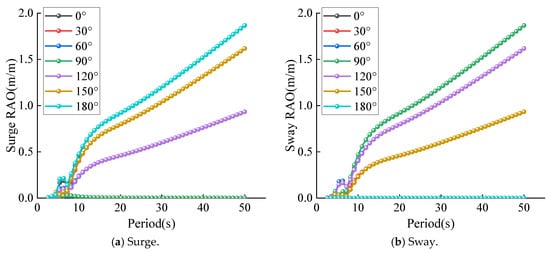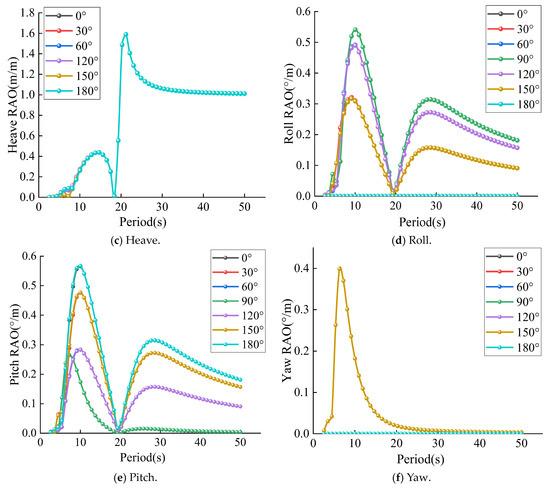 Firstly, Figure 8 shows the RAOs of the OFWT in all six DOFs when the OFWT is subjected to regular waves characterized by different wave periods and incident angles.