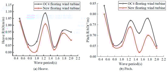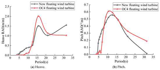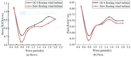 To demonstrate the superiority of the proposed platform over the conventional OC4-DeepCwind platform in ensuring the safety and reliability of the OFWT in extreme weather conditions, the RAOs of the OFWT supported by the proposed platform and the OC4-DeepCwind platform, respectively, are compared in this study. The comparison results in the heave and pitch directions are illustrated in Figure 9. Herein, the RAOs of the OFWT in the heave and pitch directions are of interest in the comparison because the safety and power generation efficiency of the OFWT can be significantly affected by the motions of the turbine in these two DOFs.