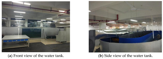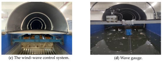 The water tank used for the model tests in this study had a length of 14.65 m, a width of 5.9 m, and a height of 1.8 m. At both ends of the tank, the outer diameter was 5.9 m and the inner diameter was 2.4 m. One side of the tank featured a glass window, which was 3 m long and 1.2 m high, as illustrated in Figure 10. The wind–wave generation system of the tank can generate waves with a maximum height of 0.2 m and a wave period ranging from 0.5 s to 5 s. Additionally, the system is capable of generating a maximum wind speed of 16 m/s in the testing section.