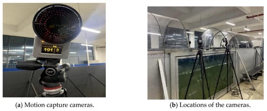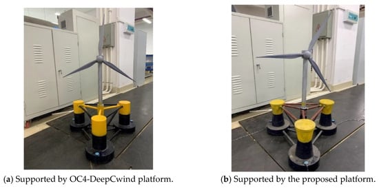 The experiment used Smart sensor software(CBG03) for collecting wave probe data and the Qualisys motion tracking system for motion capture. The six DOF motions of the OFWT were measured using four Oqus motion capture cameras provided by Qualisys, as shown in Figure 11b. The scaled models of the OFWT supported by the two types of floating platform are depicted in Figure 12.