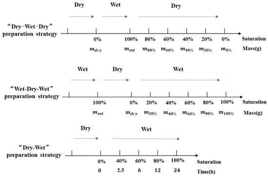 In the “dry-wet” preparation strategy, the samples were placed in a drying oven at 55 °C for 24 h to achieve complete drying, obtaining the sample mass (). Then, the samples were soaked in water for 2.5 h, 6 h, 12 h, and 24 h to obtain samples with target saturations of 0%, 40%, 60%, 80%, and 100%, and the soaking time corresponding to the saturation is obtained by referring to the pre-immersion test. Due to the inability to ensure each sample reach complete saturation under this strategy, it is not possible to accurately obtain the corresponding mass of the sample when reaching the target saturation through calculation like the previous two strategies. Therefore, only an approximate saturation can be obtained by controlling the soaking time.
