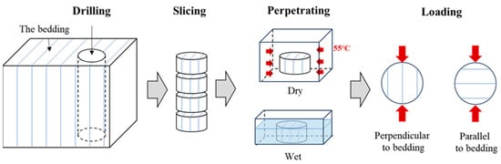 The tensile strength–saturation curves of the samples prepared using three different strategies under parallel and perpendicular bedding loading modes are shown in Figure 3.