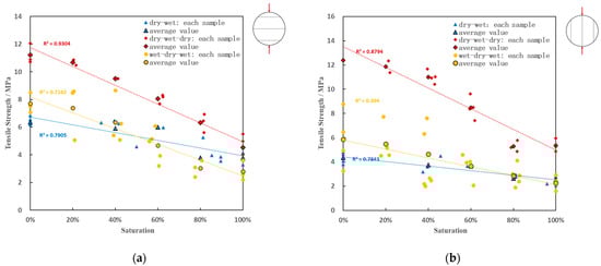 Tensile strength–saturation: (a) perpendicular bedding loading; (b) parallel bedding loading.