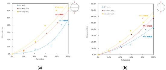 Degradation degree–saturation: (a) perpendicular bedding loading; (b) parallel bedding loading.