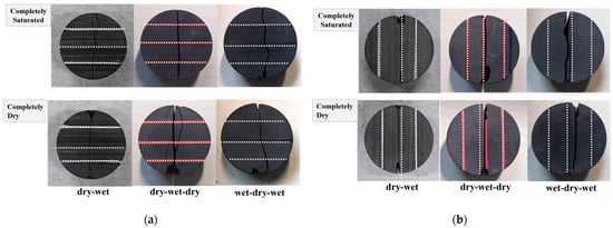 The failure modes of samples prepared using the three different sample preparation strategies in completely dry and completely saturated states are shown in Figure 6. The results indicate that the choice of sample preparation strategy affects the Brazilian splitting failure mode of water-bearing shale.
