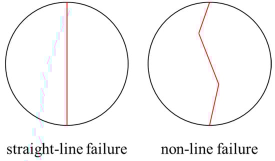Yang et al. [] categorized the Brazilian splitting failure modes of shale into crescent, arc, and straight-line types based on the angle between the bedding and loading direction. The shale samples exhibit a straight-line failure mode when the loading direction is perpendicular or parallel to the bedding.