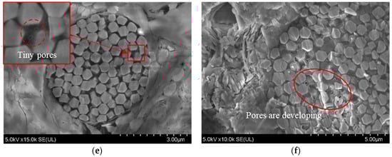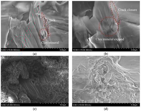 In the “wet-dry-wet” sample preparation strategy, SEM scanning was performed when the specimens reached complete saturation after the first and second wet treatments, producing images as shown in Figure 8. Figure 8a shows that even when the specimen reaches complete saturation after the first wet treatment, tiny gaps still exist between the minerals inside the shale, and the mineral surfaces exhibit granular materials. Figure 8b reveals that after complete drying and subsequent re-saturation during the second wet treatment, clay minerals exhibit significant expansion. It can be seen from Figure 8c that the minerals are exfoliated after the shale is soaked in water, and the small broken particles are distributed on the surface of the sample. After the second wet treatment, the number of these broken particles increases, as shown in Figure 8d. However, it can be seen in Figure 8e that after the first wet treatment, there are a small number of tiny pores between minerals (pyrite in the figure). After secondary immersion, these micropores tend to increase, as shown in Figure 8f. This indicates that with increased wet treatment time, the internal structure of shale, even under complete saturation, becomes looser and more fragmented. Furthermore, shale hydration exhibits time-dependent characteristics, and prolonged immersion can deepen hydration, leading to further deterioration in shale tensile strength.