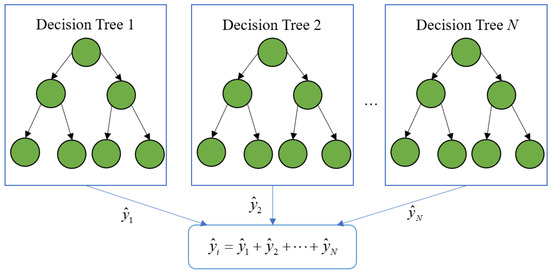 The XGBoost model is an improved boosting algorithm based on a gradient-boosting decision tree (GBDT) [30] that sets several weak classifiers to form a strong classifier with a better learning ability. A regularization term is introduced to make the trained model less easy to overfit. The first and second derivatives of the loss function are introduced for optimization, and parallel computation is supported. A structure diagram of the XGBoost model is shown in Figure 1.