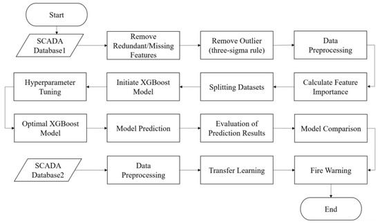 In this paper, we utilize data in the SCADA dataset for feature screening. First, we delete the feature parameters containing many zero and missing values. Then, we use the “3σ criterion” to deal with the outliers of the parameters to complete the data cleaning work. Afterward, we use the max–min normalization and the feature importance score to filter features and complete the data preprocessing work. We obtain the optimal model by adjusting the hyperparameters of the XGBoost model. We evaluate the model prediction results after the model prediction is completed. Then, we use a BP neural network and random forest to compare the prediction performance with XGBoost on dataset 1 to verify the superiority of the prediction method. We determine the alarm threshold of the offshore wind turbine unit based on error distribution analysis and complete a fire warning system for the offshore wind turbine unit. Finally, we use dataset 2 in the SCADA system as an input by transferring the trained offshore wind turbine unit, which is a 6.8 MW fire warning model, to the 8.3 MW offshore wind turbine unit to realize an 8.3 MW offshore wind turbine unit fire warning system and to test the performance of transfer learning model.