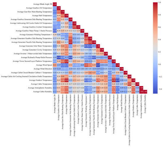 To optimize the training effect of the model, reduce the data dimension, and accelerate the model running speed, it is necessary to perform feature selection on the normalized data. We use the Pearson correlation coefficient method [42] to calculate the correlation coefficient between feature parameters. The closer the absolute value is to zero, the more uncorrelated the two variables are. The closer the absolute value is to one, the stronger the correlation between the two variables is. Less than zero indicates a negative correlation, and greater than zero indicates a positive correlation. The correlation coefficients between some characteristic parameters and the average cabin temperature are shown in Figure 5. As shown in Figure 5, when constructing the correlation coefficient matrix of the characteristic parameters of a wind turbine unit, if the absolute value of the correlation coefficient between a pair of characteristic parameters is greater than 0.95, it is considered that these two characteristic parameters have a high correlation and similar information contents.