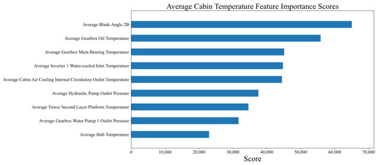 One of the characteristic parameters should be deleted, and after correlation analysis, the model characteristic parameters are reduced to 34. Due to the varying degrees of influence of these feature parameters on the prediction of average cabin temperature during model training, to optimize the training effect of the model, reduce the required data dimensions, and accelerate the prediction speed of the model, these preliminarily screened data with different information contents are re-screened. We use the “gain” weight calculation method in XGBoost to evaluate the feature parameters after preliminary feature selection based on the average information gained from splitting. The higher the score, the greater the contribution of this feature parameter to the final prediction result. Then, we delete the feature parameters with lower contributions and select the top ten feature parameters with the highest contributions for model training after screening. Figure 6 shows the importance ranking of feature parameters with higher scores in the filtered model. Figure 6 shows the correlation coefficients between the two characteristic parameters of average wind speed and average wind direction, and the average cabin temperature is relatively low. However, XGBoost obtained the highest score in the model feature importance score, indicating that XGBoost can mine the hidden correlations between the data. The faster the average generator speed, the higher the power of each piece of equipment in the wind turbine, which will increase the temperature inside the cabin. The remaining high-scoring feature parameters are all temperature parameters of various wind turbine unit components, which correlate with the average cabin temperature. When predicting the average cabin temperature, they can play a role in mutual verification and prevent the false triggering of abnormal data. The average inlet pressure of frequency converter 2 and the average side current of inverter 1 have low data variation amplitude, and the feature importance score is low in model training.