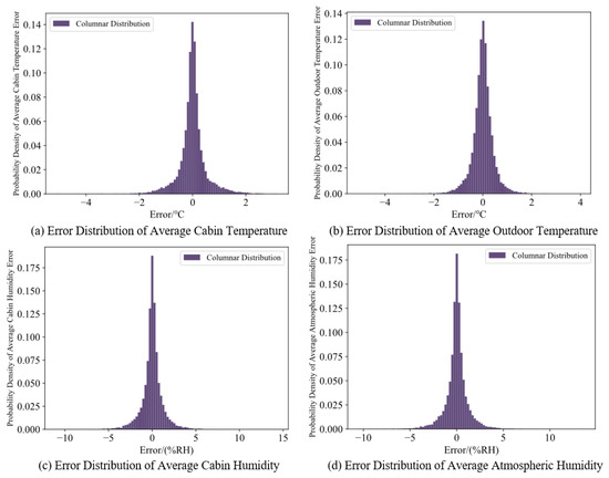 In order to improve the accuracy of predicting wind turbine units catching fire, we perform error calculations between the predicted and measured values of average cabin temperature, average outdoor temperature, average cabin humidity, and average atmospheric humidity. By setting specific threshold values for the error calculations, we determine whether a wind turbine unit is at risk of catching fire.The error distribution map of its predicted difference is shown in Figure 8. As shown in Figure 8, the horizontal axis represents the error value between the predicted and measured values, and the vertical axis represents the probability of this error value accounting for the total error values. Due to the 99.4% error values of temperature prediction being within a range of −2~2 °C, we set −3~3 °C as the threshold for fire warnings regarding average cabin temperature and outdoor temperature. For humidity parameters, 99.2% of the error values between predicted and measured values are between −5 and 5 (%RH). Therefore, we set −6~6 (%RH) as the fire warning threshold for average cabin humidity and average atmospheric humidity. The model sends out a fire alarm signal after the error exceeds the threshold for three time points to prevent the false triggering of the fire alarm.