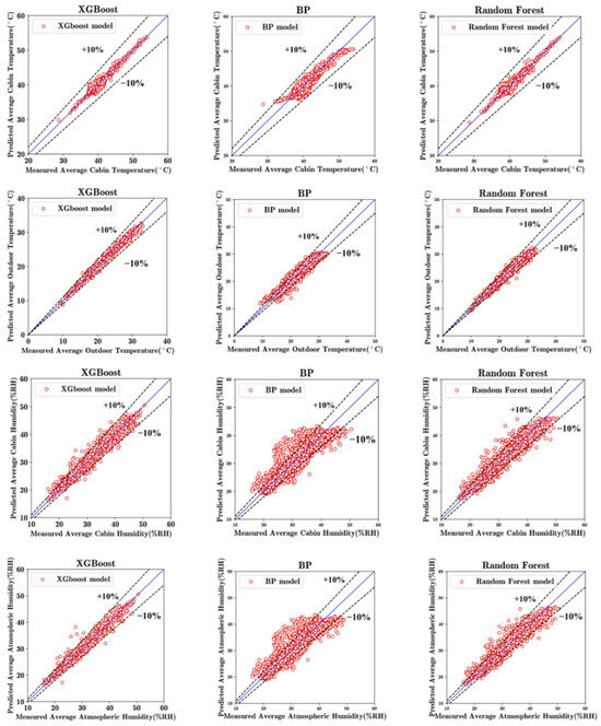 Then, we also use evaluation indicators to compare the prediction performance of the models. The MAPE and RMSE of the comparative models are shown in Table 4. Table 4 shows that the XGBoost model has better prediction performance for average cabin temperature, outdoor temperature, cabin humidity, and atmospheric humidity than the BP neural network and random forest.