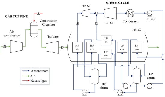 The reference combined cycle features a General Electric 9E.04 gas turbine with a nominal power output of 145 MW operating at a pressure ratio of 13.3 and reaching an exhaust temperature of 542 °C. The bottoming cycle consists of a two-pressure level heat recovery steam generator (HSRG), steam turbine, and condenser for an overall thermal efficiency of 55.0%, producing a net power output of 215 MW. The gas turbine model was built considering a simplified blade cooling model, calibrating the turbomachinery efficiencies and combustor firing temperature to reach the open-cycle efficiency and the net power output specified in the brochure datasheets. The steam turbine efficiencies were assumed from [], considering an MITA of 10 °C in the evaporators and an approach of 5 °C, while maximum steam temperature was taken as 520 °C. The combined cycle configuration is briefly depicted in Figure 1. The stream summary for this plant is presented in Table A3 in Appendix A.