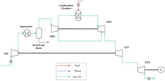 Alternatively to power generation in a combined cycle, which presents a high capital expenditure, midscale power generation may benefit from aeroderivative gas turbines operating in open cycle, since they present a higher efficiency relative to the combined cycle as well as a smaller plant footprint. For this reason, a configuration consisting of two General Electric LMS-100s is considered. These aeroderivative gas turbines achieve a power output of 117 MW with an efficiency of 44.3%. They operate at a pressure ratio of 42, substantially higher relative to industrial gas turbines, with a lower exhaust temperature (432 °C). An intercooler is used during the air compression step to enhance efficiency. The aeroderivative GE LMS-100 is a three-spool turbomachine with a high-pressure (HPT) and a low-pressure turbine (LPT) to mechanically drive a high-pressure (HPC) and low-pressure compressor (LPC), respectively, and a final power generation turbine (PGT) coupled to a generator, as depicted in Figure 2. The stream summary for this power cycle is presented in Table A3 in Appendix A.