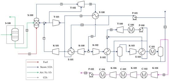 Amongst the oxy-combustion capture technologies for power generation available, one of the most prominent options is the Graz cycle []. It constitutes an advanced power generation design originally conceived as a high-temperature steam cycle fueled by H2 and O2 [], in which the Brayton and Rankine cycles are integrated to maximize synergies. This plant was adapted to carry out the combustion of natural gas and operate with a mixture of H2O and CO2 in which, after condensation of steam, the CO2 is separated and compressed in an intercooled compressor for storage, leading to CO2 mitigation costs as low as USD 17.5/ton []. In this design, a closed vacuum steam cycle is implemented to maximize performance by retrieving the condensation enthalpy of water []. This cycle can achieve notably high thermal efficiencies and therefore reduce the energy penalty associated with CO2 capture; a recent study by Mitterrutzner et al. [] indicates a thermal efficiency of 53.1% operating at nominal design conditions, although the energy intensive O2 production system imposes a large auxiliary consumption of around 10% of the fuel heat input. Syngas from oxy-blown gasification of coal or biomass can also be employed as fuel in this cycle, thus sharing a common ASU.