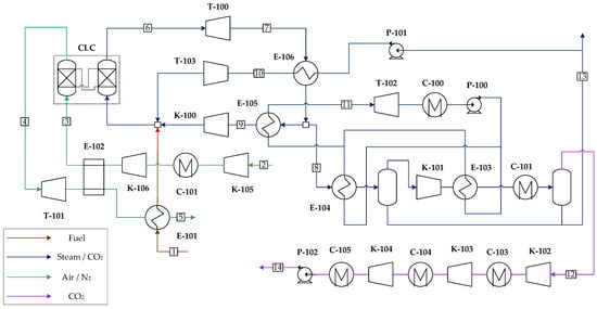 It is noted that the ASU auxiliary consumption significantly curtails the net thermal efficiency of the Graz cycle and presents a high capital investment. It is therefore proposed to employ CLC as an alternative pathway to combust the fuel, integrating a secondary power cycle in the air side, as depicted in Figure 5. Air is compressed in a two-stage intercooled compressor up to the CLC operating pressure (18 bar) and preheated in a recuperator. The flow rate of air is stoichiometrically selected to combust the natural gas fuel in the reduction reactor. In the air reactor, a N2 outlet stream is obtained, which is expanded in a turbine and then routed to the recuperator hot side to preheat incoming air to the CLC. Remnant heat from this stream and heat prior to the intercooler are used to economize water. On the reduction side, combustion products are expanded in the gas turbine and then routed to the HSRG, where HP steam is raised. Subsequently, a portion of the flow after heat recovery is recompressed and recycled to the CLC reduction reactor to control the operating temperature, while the remaining fraction is further cooled and condensed generating vacuum pressure steam (0.65 bar) for the steam cycle. After water knock out, the CO2 stream is further compressed in an intercooled compressor, dehydrated, and sent to storage pressure. It is relevant to point out that the CLC must operate at a lower temperature than conventional combustion chambers of gas turbines due to material limitations of the oxygen carrier and the valves and filters required to prevent ingress of solid particles in the turbomachinery components. This temperature limitation implies a reduction in the pressure ratio to achieve similar turbine outlet temperatures as in the Graz-CLC case from which to raise steam. An optimization for a fixed CLC operating temperature leads to a pressure ratio of 18 for a maximum thermal efficiency. Consequently, the recycle compressor does not require an intercooling stage, potentially reducing the capital costs of the cycle. The stream summary for this plant can be found in Table A5 in Appendix A.