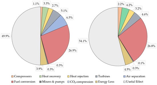 Exergy distribution for the GASU (left) and GCLC (right) plants.