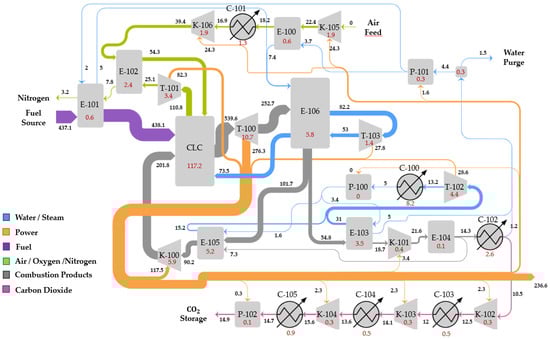 Exergy flow diagram of the GCLC plant. Values are in MW; red values indicate exergy destruction in the component.