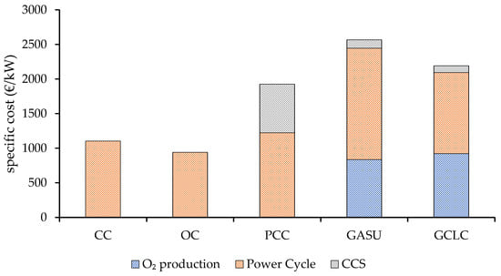 Figure 11 shows the specific capital costs (total overnight costs) per kW of electricity produced for each of the configurations based on the plant sections: O2 production, power generation, and CO2 capture. It is observed that the integration of CCS imposes a substantial additional capital requirement, which is largest for the PCC plant. The CCS scope for this configuration entails a direct contact heat exchanger, a blower to overcome the pressure losses of the absorber, the absorption and stripper column with heat exchangers, and the CO2 compressor. On the other hand, for the plants employing a Graz cycle, this scope is only limited to several compression stages with intercooling of the CO2 product and a supercritical CO2 pump. However, the cost contribution of the O2 production section is significant (CLC and air power unit for the GCLC case and the ASU for the GASU plant), ultimately leading to a specific capital investment (TOC), which is 74.7, 132.8, and 98.8% higher for the PCC, GASU, and GCLC plants, respectively, relative to the unabated CC benchmark. The OC scheme, comprising two aeroderivative gas turbines, presents a specific TOC reduction of 14.6% as the costly units of the bottoming cycle are avoided.