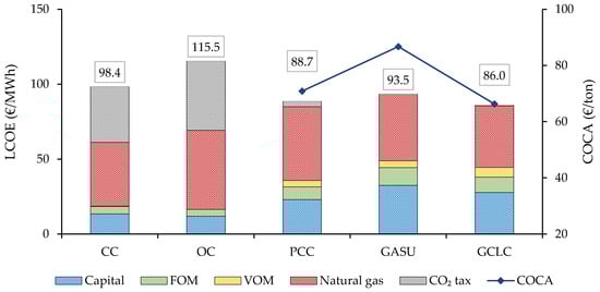 LCOE for the different power plants (bars—left axis). COCA for plants with CCS (line—right axis).