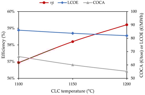 Effect of increasing CLC operating temperature on thermal efficiency (ηt), LCOE, and COCA for the GCLC power cycle.