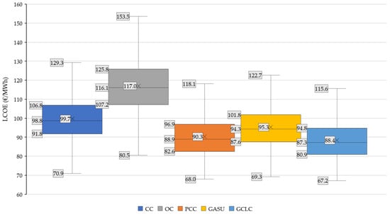 Considering the IQR for the CC plant, the results indicate that there is a 34.0% overlap between that benchmark and the PCC plant, while for the GASU configuration this results in as high as 66.7% of the values. For the GCLC plant, there is only a 20.0% overlap in the LCOE results. If this comparison is established between the PCC and the Graz cycle plants, the overlap for the GASU plant is of 65.0%, while the GCLC shares 85.3% of the IQR of the values. This highlights that the expected cost reductions of the advanced CCS options relative to post-combustion capture are relatively small, as anticipated by the prior LCOE assessment for base case economic assumptions. Interestingly, the IQR (and similarly with the differences between maximum and minimum values) for unabated plants (EUR 15–18.6/MWh) are larger relative to the plants with CCS (EUR 13.9–14.3/MWh), underlining that the capital cost uncertainty introduced by the novel plants with reduced CO2 footprint is practically offset by operational cost of CO2 emissions taxes, which, together with the natural gas price, are the economic variables that are most influential in LCOE (see Figure 12).