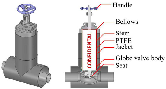 Figure 1 shows the vacuum-jacketed valve provided by a domestic company, which is utilized in liquid hydrogen storage and transport devices. It comprises a globe valve for fluid flow control with inlet and outlet diameters of 2.1 inches. The valve is composed of a valve body, stem, and jacket to protect against heat penetration from the outside, along with a seat and bellows to prevent internal and external leakage. The valve body, stem, and jacket components are made of SUS 316L, which exhibits sufficient ductility in the very low temperatures of liquid hydrogen environments. Other components, such as the seat and bellows, are made of polytetrafluoroethylene (PTFE) and ethylene propylene diene monomer (EPDM), respectively, to prevent internal and external leakage. The properties of each material are summarized in Table 1.