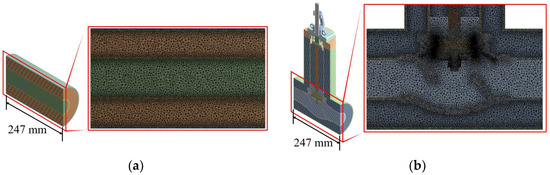 The vaporization analysis was performed to compare the BOG generation between the vacuum-jacketed pipe and valve on models with identical diameters of the inlet and outlet. The Lee model was applied using a user-defined function (UDF) in ANSYS Fluent to provide an accurate estimation of the evaporative latent heat and saturation temperature in Equation (5). The grid models for the vacuum-jacketed pipe and valve for the vaporization analysis are shown in Figure 2, consisting of 1,795,282 and 7,539,844 tetrahedral elements, respectively.