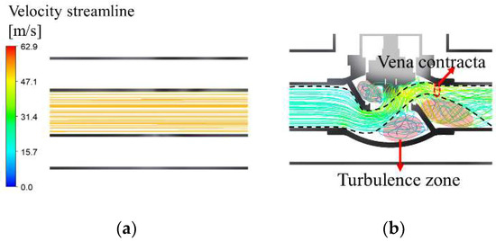 Distribution of velocity streamlines: (a) vacuum-jacketed pipe; and (b) vacuum-jacketed valve.