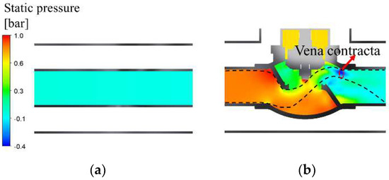 Figure 4 shows the static pressure distribution of liquid hydrogen. At the inlet of the vacuum-jacketed pipe and valve, the static pressures are 0.04 and 0.86 , respectively, with the minimum static pressure of −0.4 at the vena contracta of the vacuum-jacketed valve. In the vacuum-jacketed pipe, as shown in Figure 4a, there are no obstacles interfering with the fluid flow, resulting in low pressure head loss and a linear pressure distribution. However, in the vacuum-jacketed valve, as shown in Figure 4b, a vena contracta occurred due to the complex fluid flow geometry, which leads to fast fluid flow and low pressure. The decrease in static pressure with increased fluid flow velocity can be explained by Bernoulli’s principle, and the decreased static pressure causes the decrease in the saturation temperature , as described by Equation (5) in Section 3.1.