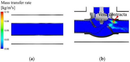 Figure 5 shows the distribution of the BOG mass per unit volume and time, where the maximum values are 0.0007 and 0.1 at the vacuum-jacketed pipe and valve, respectively. The BOG generated in the vacuum-jacketed pipe is negligibly small, whereas at the vacuum-jacketed valve, as shown in Figure 5b, it peaks at the vena contracta where the pressure and decrease.