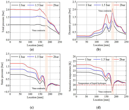Figure 6 shows the total pressure, dynamic pressure, static pressure, and saturation temperature of the liquid hydrogen along the main fluid flow from the inlet to the outlet of the vacuum-jacketed valve, where the location of the vena contracta is denoted by the shaded area. The total pressure represents the fluid energy, where the total pressures at the inlet correspond to the tank pressures, as shown in Figure 6a. The total pressure decreases drastically as the liquid hydrogen passes through the valve body due to the dissipation effect of turbulence, which reduced the fluid energy [14]. Figure 6b,c exhibit the dynamic and static pressures, respectively, showing a negative correlation between them. The maximum dynamic pressures of 1.25, 1.79, and 2.08 bar occur at the vena contracta for tank pressures of 1, 1.5, and 2 bar, respectively, while the minimum static pressures at the same location are −0.27, −0.37, and −0.43 bar. These values, when converted to absolute pressure, are 0.74, 0.65, and 0.59 bar, respectively. Changes in the with the tank pressures, as shown in Figure 6d, exhibit similar trends to those in the static pressure. The minimum occurs at the vena contracta, and they are 19.3, 18.9, and 18.6 K for tank pressures of 1, 1.5, and 2 bar, respectively. Because the BOG mass reaches its maximum at the vena contracta where both the static pressure and are lowest, as shown in Figure 5, the changes in the BOG mass with the tank pressures are significantly influenced by the static pressure and .