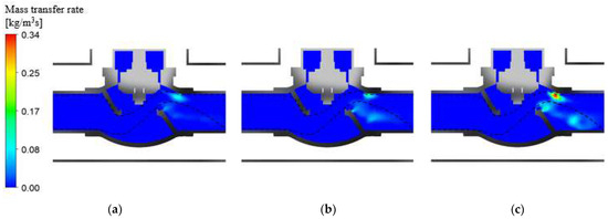 Distribution of mass transfer rate for BOG in vacuum-jacketed valve regarding tank pressures: (a) 1 bar; (b) 1.5 bar; and (c) 2 bar.
