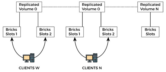 An open-source distributed file system called Gluster-FS can support thousands of concurrent connections and petabytes of data. It is built for linear scale-out. Its user space architecture is modular and stacking, forming a tree with each functional module referred to as a translator. Bricks are actual storage units assigned to the DFS in this system. Communication between data nodes makes copy shifting, high data replication, and data distribution rebalancing possible. Figure 2 shows the replicated Gluster within Gluster-FS, a particular configuration called replicated Gluster or replicated volume.