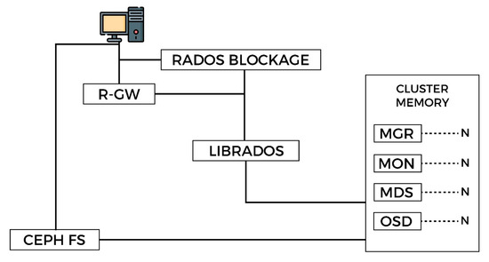 Ceph is considered an open-source file network distributed file management system created by the University of California and is run by the Ceph Foundation [24,25]. This system makes unified object, block, and file storage possible. As shown in Figure 5, Ceph offers dependable and high-performance storage capacities ranging from petabytes to exabytes via the use of the Reliable Autonomous Distributed Object Store (RADOS). MON is used to keep a master copy of the cluster map; then, arrangement shows the copy of the cluster. Figure 5 explains the structure of Ceph.
