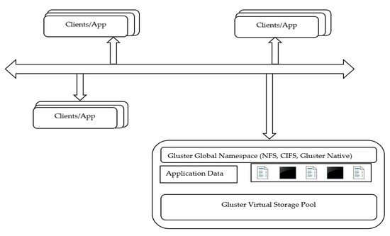 GlusterFS seamlessly accommodates standard clients executing applications over conventional IP networks. As depicted in Figure 7, the system exemplifies the accessibility of application data and files within a global namespace, employing standard protocols like NFS and SMB/CIFS [50,51,52,53,54,55,56]. Notably, the system’s architecture is optimized to leverage commodity software, ensuring compatibility with almost any operating system without necessitating kernel fine-tuning.