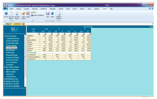 Load flow analysis software SynerGEE Electric detail feeder results from each phase (3-phase electric system installed in Pakistan), with total load and loss calculation.