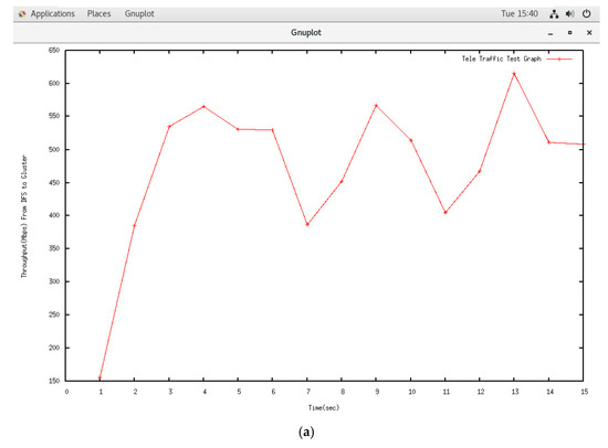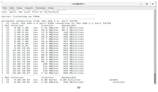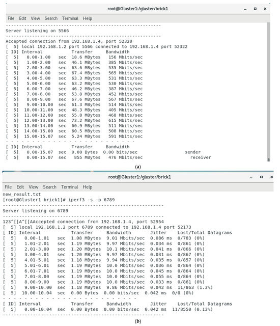 The bandwidth and transfer rate for TCP and UDP throughput is calculated for 15 s of simulation time when the media file of 1000 GB is sent from enterprises to both Gluster-FS and replicated Gluster. Statistical data fetched from the I-Perf utility after 15 are shown in Figure 29.