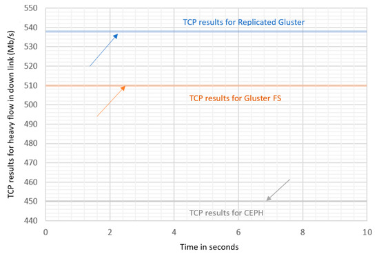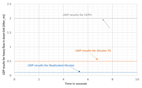 A comparison of different methods for virtual data storage discussed in Table 1 is carried out with the proposed virtual data storage method RG (replicated Gluster) in terms of UDP and TCP test results. The TCP results comparison is shown in Figure 31, and the UDP results comparison is shown in Figure 32. The results demonstrate that replicated Gluster performance is far superior to traditional data storage systems.