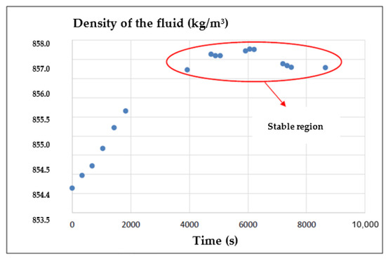 The change in the BSW level was evaluated by inserting water into the closed circuit. Figure 2 shows the monitoring of the results of measuring the density of the fluid using the Coriolis flow meter. After the insertion of water into the circuit, until the fluid is homogenized, the density tends to vary until it reaches a region of stability where it is possible to continue with the other stages of the experiment.
