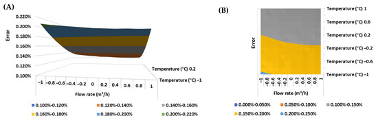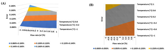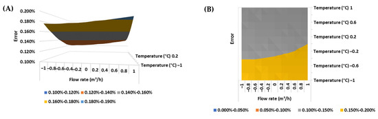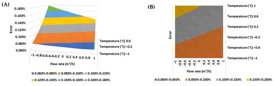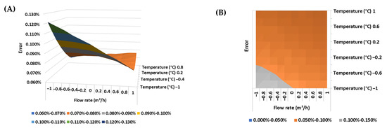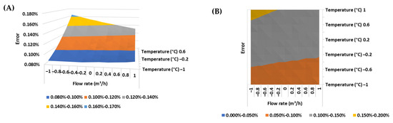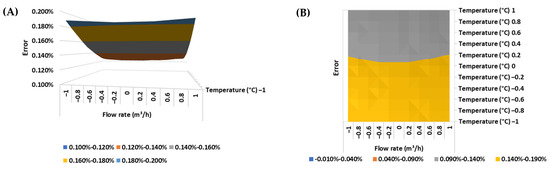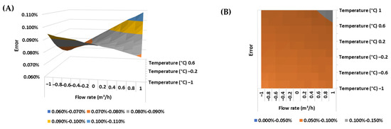 (A) Response surface and (B) contour plot of the error of the ultrasonic flow meter in the BSW condition equal to 0% v/v.