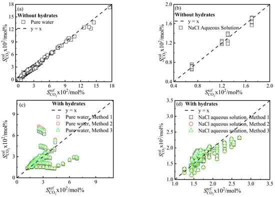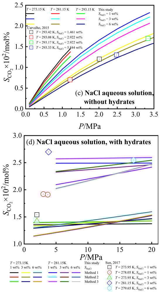 - Sun, Q.; Tian, H.; Guo, X.; Liu, A.; Yang, L. Solubility of CO2 in water and NaCl solution in equilibrium with hydrate. Part II: Model calculation. Can. J. Chem. Eng. 2017, 96, 620–624. [Google Scholar] [CrossRef]