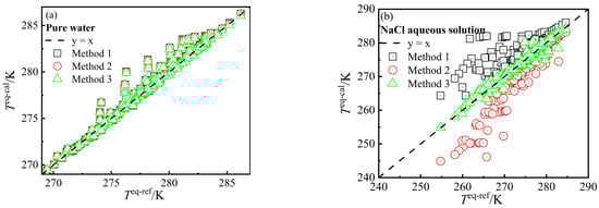 is often considered a constant value [101,102]. This is a result of assuming that the difference between the density of empty hydrate cavities () and pure water () do not vary with temperature and pressure, which makes independent of guest molecules and theoretically can be used for the calculation of all Type I hydrates. However, the actual varies with temperature and pressure conditions, and recent research results [103] have shown that relates to the type of guest molecules, as well as temperature and pressure conditions. Therefore, to expand the applicable temperature and pressure range of the above model and improve its accuracy, this study did not consider to be constant, but calculated it according to its original definition as follows: