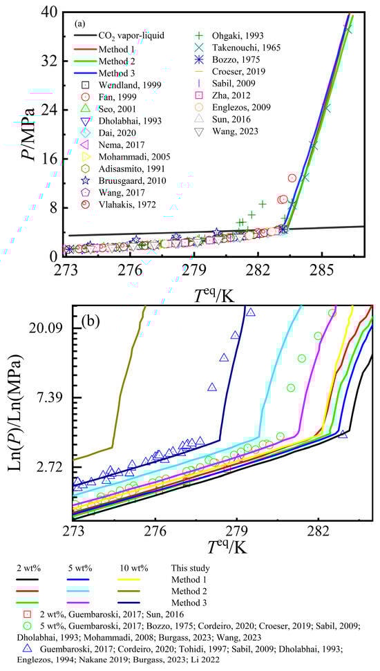 Understanding the phase equilibrium conditions of CO2–pure water/NaCl aqueous solution–CO2 hydrate is a prerequisite for calculating CO2 solubility. In the meantime, based on the CO2 solubility data, the phase equilibrium conditions of CO2–pure water/NaCl aqueous solution–CO2 hydrate can also be predicted. Limited experimental studies have been conducted on CO2 solubility and phase equilibrium conditions of CO2–pure water/NaCl aqueous solution mixtures within the temperature and pressure range of 273.15~298.15 K and 0.1~40 MPa due to the involved extreme environments such as high pressure. The relevant studies we can obtain include: studies on the phase equilibrium conditions of CO2–pure water [11,16,17,18,19,20,21,22,23,24,25,26,27,28,29,30,31,32,33,34,35]/NaCl aqueous solution [11,20,30,31,32,34,35,36,37,38,39,40,41,42,43,44]-CO2 hydrate, studies on CO2 solubility in pure water [11,45,46,47,48,49,50,51,52,53] and NaCl aqueous solution [54] in systems without hydrates, as well as studies on CO2 solubility in pure water [11,12,36,47,48,50,52,53,55,56,57,58,59,60,61] and NaCl aqueous solution [11,36,57,62] in systems with hydrates.