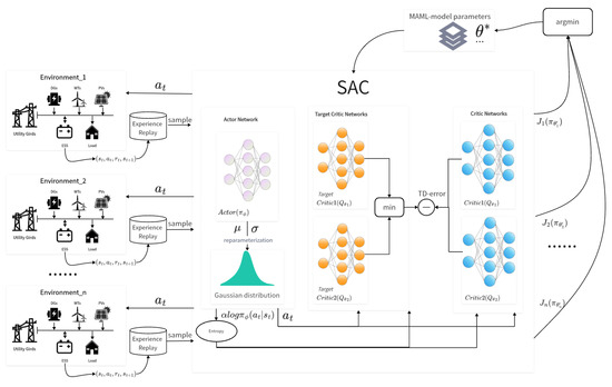 1. This paper proposes a novel algorithm based on Model-Agnostic Meta-Learning (MAML) and Soft Actor–Critic (SAC), Model-Agnostic Meta-Learning for Soft Actor–Critic (MAML-SAC), which is able to quickly adapt to new microgrid environments with a small amount of training data. Compared to the Soft Actor–Critic algorithm, the algorithm proposed in this paper makes better decisions in the early stage of microgrid operation with scarce data.