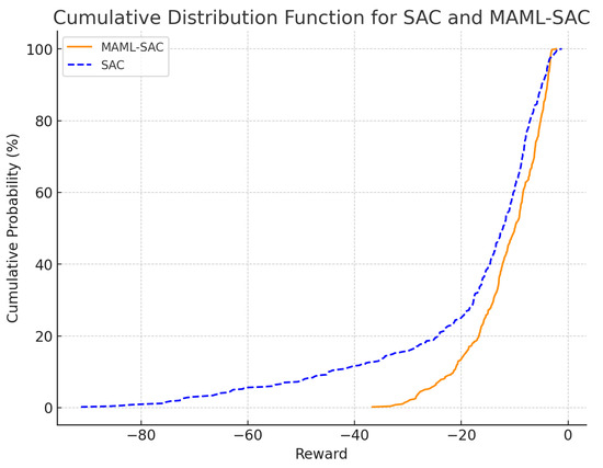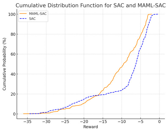 The CDF of rewards for the SAC and MAML-SAC algorithms with one month of training data.